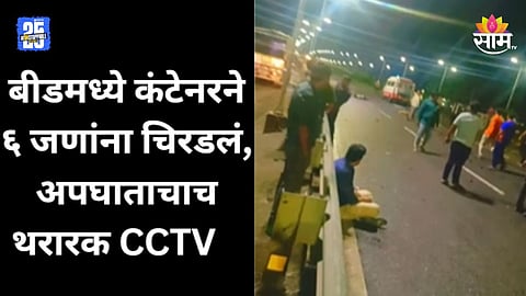 बीडमध्ये सोमवारी रात्री उशिरा झालेल्या भीषण अपघातामध्ये ६ जणांचा दुर्देवी मृत्यू झाला. धुळे-सोलापूर राष्ट्रीय महामार्गावरील गढी फाट्याजवळ हा अपघात झाला. हा अपघात इतका भीषण होता की यामध्ये सहा जणांचा जागीच दुर्दैवी मृत्यू झाला तर एक जण गंभीर जखमी झाला. या अपघाताचा थरार सीसीटीव्हीत कैद झाला आहे. हा सीसीटीव्ही व्हिडीओ सध्या व्हायरल होत आहे.