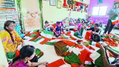 जळगाव : स्वातंत्र्याच्या अमृत महोत्सवानिमित्त ‘हर घर तिरंगा’ ही मोहीम हाती घेतली आहे. या मोहिमेत शासनासह अनेक संस्था, संघटना सहभागी झाल्या आहेत. यात ‘हर घर तिरंगा’ उपक्रमासाठी स्वयंदिप (Jalgaon) संस्थेच्या दिव्यांग महिला दिवसाला १ हजारपेक्षा जास्त तिरंगा शिवत आहेत. (Jalgaon News Independence Day)