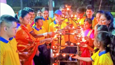 जळगाव : सर्वत्र दिवाळीचा उत्साह सुरू असतांना दिव्यांग, गतिमंद मुलांनी देखील सामाजिक भावना जपत आगळ्या-वेगळ्या पद्धतीने दीपोत्सव साजरा केला आहे. रुशील मल्टिपर्पज फाऊंडेशन संचलित उडान दिव्यांग प्रशिक्षण केंद्रातर्फे दिवाळीच्या पूर्वसंध्येला चिमुकले श्रीराम मंदिरात ११५१ दीप प्रज्वलित करण्यात आले. (jalgaon-news-Shriram-temple-lit-by-the-hands-of-the-cripples-one-thousand-151-lamps-lit)
