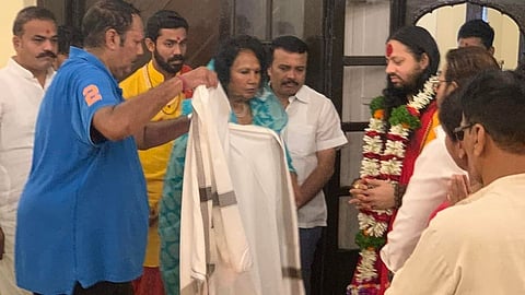 सातारा : सातारा येथील जलमंदिर पॅलेस येथे आज (साेमवार) काली चरण महाराज यांनी तुळजाभवानी मातेचे दर्शन घेतले. त्यावेळी राजमाता कल्पनाराजे भाेसले आणि खासदार उदयनराजे भाेसले यांनी त्यांचे स्वागत केले.