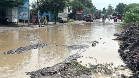 लातूर : जिल्ह्यातील रेणापूर तालुक्यातील पानगांव येथुन जाणाऱ्या राष्ट्रीय महामार्ग क्रं.३६१ एच वर संभाजी चौक ते वैभव बिअर बार दरम्यान रस्त्यावर ५ मिनीट पडलेल्या पावसाने रस्त्यावर गुडघाभर पाणी साचल्याने राष्ट्रीय महामार्गाला तलावाचे स्वरुप आले आहे. या महामार्गाच्या निर्मितीला लोकप्रतिनिधींचा नाकर्तेपणा आणि राष्ट्रीय महामार्ग विभागाची उदासिनता कारणीभुत आहे.