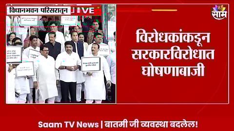 ४० टक्केवारी घेणारं सरकार हाय हाय,'शेतकरी उपाशी महायुती सरकार तुपाशी, 'शेतकरी विरोधी महायुती सरकारचा धिक्कार असो 'अशा घोषणा देत विरोधकांनी विधीमंडळाचा परिसर दणाणून सोडला. मुंबई येथे पावसाळी अधिवेशनाच्या पहिल्याच दिवशी महाविकास आघाडी आक्रमक झाली. त्यांनी पहिलाच विधान भवनाच्या पायऱ्यांवर शेतकऱ्यांची कर्जमाफी झाली, पाहिजे यासाठी आंदोलन केलं. मुख्यमंत्री एकनाथ शिंदे आणि उपमुख्यमंत्री देवेंद्र फडणवीस, उपमुख्यमंत्री अजित पवार यांच्या समोरच विरोधकांनी जोरदार घोषणाबाजी केली. कमिशनखोर आणि टक्केवारी सरकार हाय हाय अशी घोषणाबाजी विरोधकांनी केली.