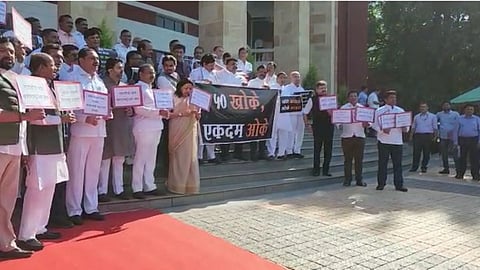 राष्ट्रवादी काँग्रेस, काँग्रेस आणि शिवसेना (उद्धव बाळासाहेब ठाकरे) गटाच्या आमदारांनी पहिल्याच दिवशी शिंदे आणि फडणवीस सरकारला घेरण्याचा प्रयत्न केला. विधानसभांच्या पायऱ्यांवर विरोधी पक्षाच्या नेत्यांनी जोरदार घोषणाबाजी केली. ५० खोके, एकदम ओके अशा घोषणांचे बॅनर घेऊन जोरदार घोषणाबाजीही केली. (Winter Session)