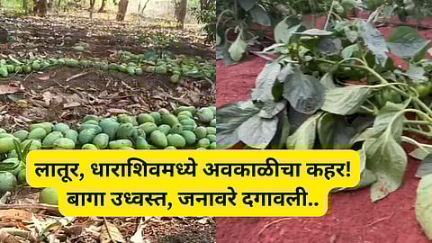 लातूर (Latur) जिल्ह्यातल्या अनेक भागात वादळी वाऱ्यासह गारपीट झाली. जिल्ह्यात एकूण 13 जनावरे आणि दोन व्यक्तींचा वीज पडून मृत्यू झाला आहे. दरम्यान या गारपीटने जिल्ह्यातील काढणीला आलेल्या शेतीपिकाचे आणि केशर या आंबा फळबागेच अतोनात नुकसान झालं अक्षरशः आंब्याची रास झाडाखाली झाली आहे. जिल्ह्यातील शेती पिकांचं आणि फळबागेचे मोठे नुकसान झाले आहे.