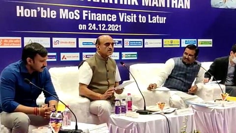 लातूर : केंद्रीय अर्थ राज्यमंत्री डॉ. भागवत कराड (Bhagvat Karad) हे लातूर जिल्हा दौऱ्यावर होते. त्यांच्या उपस्थितीत आज राज्यस्तरीय बँकर्स समिती आणि बँक ऑफ महाराष्ट्रच्या वतीने मराठवाडा आर्थिक मंथन या कार्यक्रमाचे आयोजन करण्यात आले होते. राज्याच्या इतर भागाच्या तुलनेत मराठवाड्यात बँकेचे म्हणावे तसे जाळे नाही. त्यामुळे मराठवाड्यात बँकांचे जाळे अधिकाधिक मजबूत करण्याच्या दृष्टीने या कार्यक्रमाचे आयोजन करण्यात आले होते.