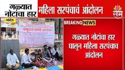 नांदेड : जिल्हा परिषद कार्यालयाच्या अंतर्गत येणाऱ्या ग्रामपंचायतीमध्ये कुठलेही काम होत नसल्याने अखेर महिला सरपंचाने चक्क गळ्यात नोटांचा हार घालून जिल्हा परिषद कार्यालयासमोर धरणे आंदोलन सुरू केलं आहे. पैसे दिल्याशिवाय कुठलंही काम जिल्हा परिषद कार्यालयातील अधिकारी करत नाहीत, असा आरोप या महिला सरपंचाचा आहे. नांदेड तालुक्यातील इंजेगाव येथील मुक्ताई पंचलिंगे असं या आंदोलन करणाऱ्या महिलेचं नाव आहे.