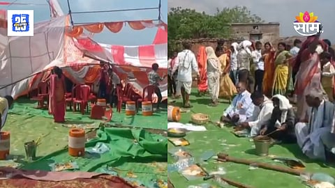 नांदेड : नांदेड जिल्ह्यात मागील दोन ते तीन दिवसापासून सतत वादळी वाऱ्याने थैमान. आज देखील सायंकाळच्या सुमारास वादळी वाऱ्याने थैमान घातलं. नांदेडच्या मुखेड तालुक्यातील कमला नगर तांडा येथे वादळी वाऱ्यामुळे लग्न मंडप उडून गेला आहे. लग्न मंडप उडून गेल्याने वऱ्हाडी मंडळीची चांगलीच धावपळ उडाली. या घटनेत काही जण किरकोळ जखमी देखील झाल्याची माहिती आहे. या घटनेचा व्हिडिओ सध्या प्रचंड व्हायरल होत आहे. या व्हिडिओमध्ये दिसत आहे, की एवढं घडूनसुद्दा काही लोकं निवांत बसून जेवण करताय.