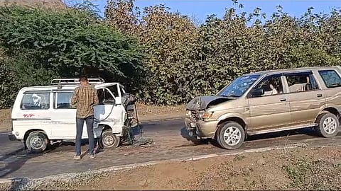 धुळे सुरत राष्ट्रीय महामार्गावर (Dhule Surat Highway Accident) कोंडाईबारी घाटाच्या पायथ्याशी भीषण अपघात झाला. साक्रीहून नवापूरच्या दिशेने जाणारी तवेरा कार आणि विसरवाडीहून साक्रीच्याविरुध्द दिशेने जाणाऱ्या ओमनी कारला ओव्हर टेक करण्याच्या नादात धडक दिल्याने ही घटना घडली. या अपघातात ओमनी कार वाहनातील चार जण जखमी असून दोन्ही वाहनांचे मोठे नुकसान झाले आहे.