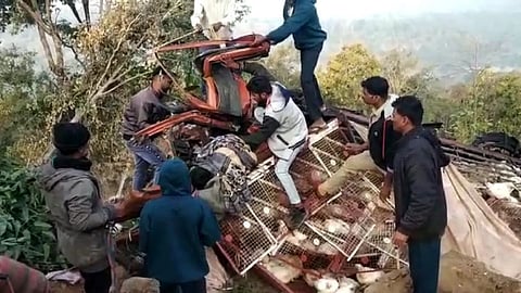 कोंबड्यांची वाहतुक करत असलेल्या टेम्पोच्या अपघातात चालक व सहचालक दोन्ही जखमी झाले आहेत. स्थानिक नागरिकांच्या मदतीने चालकाला नवापूर व अतिगंभीर जखमीला नंदुरबार जिल्हा रुग्णालयात उपचारासाठी दाखल करण्यात आले आहे. तर अपघातग्रस्त टेम्पोत असलेल्या कोंबड्यांचा चेंदामेंदा झाला आहे.