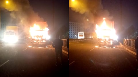 नाशिक - मुंबई आग्रा महामार्गावर नाशिकच्या (Nashik) पाथडी फाटा जवळ रात्री धावत्या कंटेनरला भीषण आग लागली होती. या आगीत जीवितहानी झाली नाही मात्र वितहानी झाली आहे. मुंबईहून नाशिकच्या दिशेने येणाऱ्या कंटेनरला अचानक आग लागल्याने एकच खळबळ उडाली. घटनेची माहिती मिळताच घटनास्थळी अंबड पोलीस ठाण्याचे कर्मचारी व अग्निशमन विभागाचे कर्मचारी तात्काळ दाखल झाले.