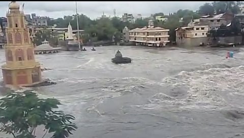 नाशिक : येथील प्रसिद्ध सोमेश्वर धबधब्यास गोदावरी नदीच्या पुराच्या पाण्याने वेढले आहे. आज (बुधवार) सकाळ पासून गंगापूर धरणातून दहा हजार क्यूसेक पाण्याचा विसर्ग करण्यात आला आहे. यामुळे गंगापूर रस्त्यावरील गोदावरी नदीवर असलेल्या सोमेश्वर धबधब्याला देखील पुराच्या पाण्याने वेढल्याचे चित्र पाहायला मिळत आहे. nashik-rain-update-godawari-flooded-someshwar-waterfall-sml80