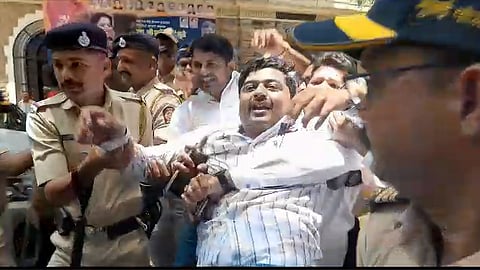 शिंदे- फडणवीस सरकारच्या (Shinde-Fadnavis Government) विरोधामध्ये राष्ट्रवादी काँग्रेसकडून राज्यभरामध्ये गद्दार आणि खोके दिवस साजरा करण्यात येत आहे. राष्ट्रवादीच्या या आंदोलनावेळी (NCP Protest) '50 खोके एकदम ओके' अशा घोषणा करत सरकारचा निषेध केला आहे. मुंबई पोलिसांनी (Mumbai Police) आंदोलन करणाऱ्या राष्ट्रवादी कार्यकर्त्यांना ताब्यात घेतले आहे.