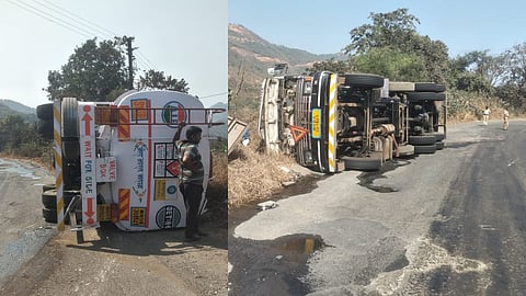 रत्नागिरी : घाटातील उतारात ब्रेक न लागल्यामुळे टँकर उलटला आहे. मुंबई-गोवा महामार्गावरील घटना असून यात टँकर चालक अपघातात (Accident) किरकोळ जखमी झाला आहे. डिझेलचा ट्रँकर असल्याने पुढची दुर्घटना टाळण्यासाठी घटनास्थळी लागलीच अग्निशमन दलाचे (Fire Brigade) बंब दाखल झाला. (Breaking Marathi News)