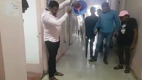सातारा पालिकेच्या समोरच पाण्याच्या व्हॉल्व्हला गळती लागल्याने लाखो लिटर पाणी वाया चालले होते. हे सर्वांना दिसत हाेते मात्र त्याबाबत काेणीच काही हालचाली करीत नव्हते. आज सातारा पालिकेच्या कारभारा विरोधात संतापलेल्या भाजपचे नगरसेवक सुनील काळेकर यांनी चक्क पालिकेत असणाऱ्या अतिरिक्त मुख्याधिकारी यांच्या कक्षा बाहेर पाणी ओतून निषेध व्यक्त केला.