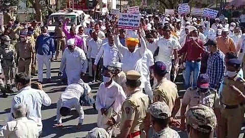 बंडातात्या कराडकर यांच्यासह व्यसनमुक्त युवक संघचे कार्यकर्ते हे आक्रमक झाले आहे. पाेवई नाका ते जिल्हाधिकारी कार्यालय येथे आंदाेलकांनी दंडवत घालून सरकाराच्या वाईन विक्रीच्या निर्णयाचा विराेध केला आहे.