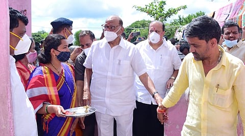 राष्ट्रीय महामार्गाच्या भूमिपूजन समारंभासाठी शरद पवार नगर दौऱ्यावर आले होते. त्यावेळी त्यांनी लंके यांच्या घरी भेट दिली. लंके यांच्या घरी अल्पोपहारही घेतला.Sharad Pawar visited MLA Nilesh Lankes house abn 79