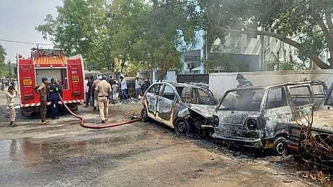शिवाजीनगर पोलिसांनी जप्त केलेली आणि चोरीची वाहने पाेलीस ठाण्याच्या पाठीमागील मोकळ्या जागेत ठेवली होती. यात दुचाकी आणि चार चाकी वाहनांचा समावेश आहे. आज दुपारी उन्हामुळे चार चाकी वाहनातील बॅटरी गरम होऊन आग लागल्याचा अंदाज व्यक्त केला जात आहे.