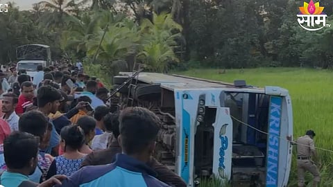 सिंधुदुर्गच्या वेंगुर्ला शिरोडा येथून चाकरमान्यांना घेऊन मुंबईला निघालेली खासगी बस तुळस येथे उलटली आहे. या खासगी बस समोरील वाहनाला बाजू देताना ब भातशेतीत कोसळली आहे. या खासगी बसमध्ये ५५ ते ६० प्रवासी होते. समोरून येणाऱ्या वाहनाला जागा देत असल्याने बसचा वेग कमी होता. त्यामुळे बस जागेवरच उलटली. त्यामुळे मोठा भीषण दुर्घटना टळली आहे.