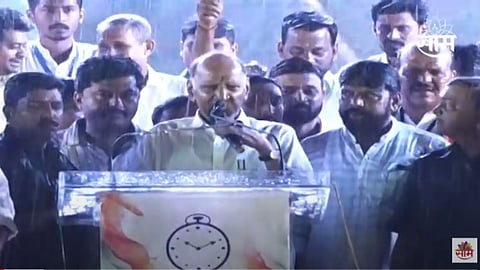 राष्ट्रवादी काँग्रेसचे अध्यक्ष शरद पवार यांचा नवी मुंबई येथे कार्यकर्ता मेळावा आयोजित करण्यात आला होता. पण सभेला शरद पवारांच्या आधी पावसाने हजेरी लावली. २०१९ च्या विधानसभेच्या निवडणुकीच्या प्रचार सभेत शरद पवार पावसात भिजले आणि अख्खा निवडणुकीचा निकाल बदलला. याहीवेळी तसाच काहीसा चमत्कार होतो का? असा कार्यकर्त्यांना विश्वास होता. पण यावेळी शरद पवारांनी पावसामुळे भाषण आटोपतं घेतलं. अगदी दोन मिनिटात पवारांनी आपल्या भाषणाची सांगता केली.