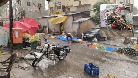 पुणे जिल्ह्यात अवकाळी पावसाची हजेरी लावली. पुण्याच्या भोर तालुक्यातील काही भागात अवकाळी पावसाची हजेरी लावली. अचानक आलेल्या पावसाळे नागरिकांचे हाल झाले. अवकाळी पावसामुळे हवेत गारवा निर्माण होऊन उष्णतेपासून नागरिकांना दिलासा मिळाला. पण शेतकऱ्यांसह अनेकांसाठी पाऊस डोकेदुखी ठरला आहे. भोरच्या आठवडे बाजाराला या अवकाळी पावसामुळे फटका बसला. अचानक आलेल्या पावसामुळे शेतकऱ्यांसह बाजार करण्यासाठी आलेल्या नागरिकांची धावपळ झाली. बाजारातील भाजीपाला भिजला त्यामुळे विक्रेत्यांचे नुकसान झाले.