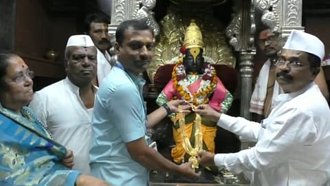 कल्याण येथील विठ्ठल भक्त वंदना म्हात्रे या पंढरपूरात (pandharpur) सहकुटुंब आल्या हाेत्या. त्यांनी विठ्ठल रुक्मिणीचे दर्शन घेण्यापुर्वी मंदिर समितीच्या व्यवस्थापकांची भेट घेतली. या भेटीत त्यांनी विठ्ठलाच्या चरणी साेन्याचा चंदन हार अपर्ण करण्याची भावना व्यक्त केली. (Maharashtra News)