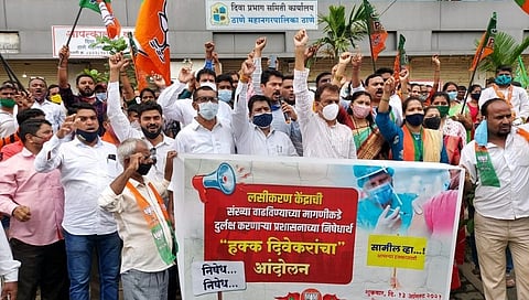 दिवा : दिवा शहरात लसीकरण केंद्राची संख्या वाढविण्यासाठी आज भाजप तर्फे "हक्क दिवेकरांचा" हे आंदोलन करण्यात आले. दिवा प्रभाग समिती कार्यालयाबाहेर हे आंदोलन करण्यात आले. यावेळी प्रशासनाविरोधात भाजप कार्यकर्त्यांनी जोरदार घोषणाबाजी केली. तर शिवसेनेचे नगरसेवक आपल्या मर्जीतल्या लोकांना आणि कार्यकर्त्यांना लस मिळवून देतात असा आरोप भाजप जिल्हा उपाध्यक्ष निलेश पाटील यांनी केला. (agitation by BJP in Diva for vaccination)