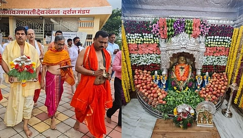 पुणे - अष्टविनायक महागणपती रांजणगाव Ranjangaon येथे चार दिवसांचा व्दारयात्रा उत्सव संपन्न झाला आहे. आज श्री गणेश ganpati चतुर्थी निमित्त आकर्षक आशा विविध रंगी फुलांनी मंदिराचा temple गाभारा सजवण्यात आला होता. तसेच लाडक्या बाप्पाला 501 डाळिंबाचा महानैवेद्य देखील दाखविण्यात आला.