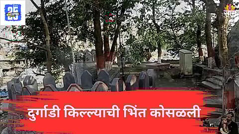 ऐतिहासिक दुर्गाडी किल्ला ही कल्याण शहराची शान आणि प्राचीन वैभव आहे. गेल्या काही वर्षांपासून किल्ल्याचे बुरुज आणि भिंत कोसळल्याच्या घटना घडल्या होत्या. या पार्श्वभूमीवर किल्ले दुर्गाडीचे देखभाल दुरुस्तीची मागणी केली जात होती. पुरातत्व विभाग आणि पीडब्ल्यूडीच्या माध्यमातून या किल्ल्याच्या देखभाल दुरुस्तीचे काम हाती घेण्यात आले. यामध्ये किल्ल्याचे बुरुस किल्ल्याचे संरक्षक भिंत बांधण्याचे काम सुरू आहे. हे काम सुरू असतानाच आज बुधवारी पहाटेच्या सुमारास या किल्ल्याच्या गोविंदवाडी बायपास दिशेला असलेल्या संरक्षण भिंतीचा भला मोठा भाग अचानक कोसळला. त्याच पाठोपाठ सकाळच्या सुमारास किल्ल्याचा कठडा देखील कोसळला.