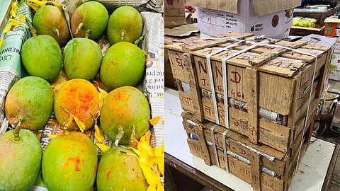 मुंबई : हापूस प्रेमींसाठी एक आनंदाची बातमी आहे. 'कोकणचा राजा' समजल्या जाणाऱ्या रत्नागिरी हापूस आंब्याची पहिली पेटी मुंबईत (Mumbai) दाखल झाली आहे. मुंबईतील कृषी उत्पन्न बाजार समितीमध्ये ही पेटी दाखल झाली आहे. फळ व्यापारी विजय ढोले यांच्या निवृत्ती नानाजी ढोले अँड सन्समध्ये यंदाच्या हंगामातील पहिल्या आंब्याच्या दोन पेट्या दाखल झाल्या आहेत. (Latest Marathi News)