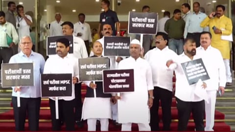 महाविकास आघाडीच्या नेत्यांनी गुरुवारी (ता. २९) विधानभवनाच्या पायऱ्यांवर लक्षवेधी आंदोलन केलंय. "राज्यात सतत होणाऱ्या पेपरफुटीवरून विद्यार्थी त्रस्त, सत्ताधारी मात्र फोडाफोडीत व्यस्त", असे फलक हाती घेऊन विरोधकांनी विधानभवनाच्या पायऱ्यांवर सरकारविरोधात घोषणाबाजी केली आहे.