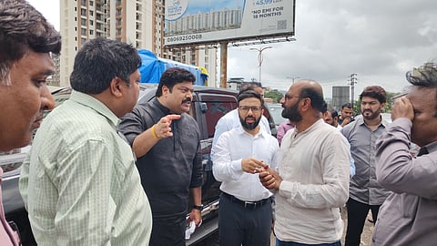 कल्याण शीळ रोडवरील पलावा जंक्शन पूलाचे काम संथगतीने सुरू असल्याने कल्याण शीळ रोड वर मोठ्या प्रमाणात वाहतूक कोंडी होते. या पुलांच्या कामाला गती मिळावी यासाठी आज मनसे आमदार राजू पाटील, एमएसआरडीसीचे सहाय्यक संचालक मनोज जिंदाल यांनी या पुलाची पाहणी केली. यावेळी काम संथ गतीने सुरू असल्याचे निदर्शनास आले. पुलावर अवघे चार कामगार काम करत असल्याने आमदार राजू पाटील संतापले.