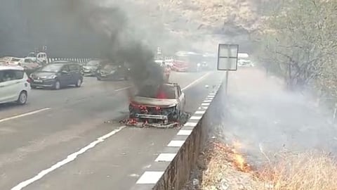 मुंबई पुणे एक्सप्रेस वेवर खोपोली जवळ पुणे लेनवर ही दुर्घटना घडली असून या घटनेत कार जळून खाक झाली. सुदैवाने या घटनेत कुठल्याही जीवीतहानी झालेली नाही. घटनेची माहिती मिळताच अग्नीशमन दलाचे जवान घटनास्थळी दाखल झाले. मात्र अग्नीशमन दलाला आग विझवण्यात अद्याप यश आलेले नाही. या घटनेमुळे महामार्गावर लांबच लांब वाहनाच्या रांगा लागल्याचं पाहायले पाहायला मिळाले. दरम्यान ही आग नेमकी कशी लागली याची माहिती अद्याप समोर आलेली नाही. (Pune News)