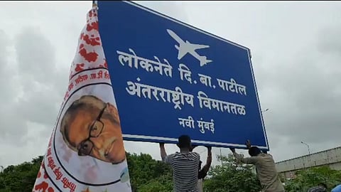 Navi Mumbai News : नवी मुंबई आंतरराष्ट्रीय विमानतळाच्या क्षेत्रात प्रकल्पग्रस्तांनी दि. बा. पाटील (Dinkar Balu Patil) यांच्या नावाची पाटी लावत आजच्या क्रांतिदिनी (ता.9 ऑगस्ट) सरकराला लवकरात लवकर विमानतळाचे नामकरण करावे अन्यथा माेठं आंदाेलन छेडण्याचा इशारा दिला. यावेळी माेठ्या संख्येने प्रकल्पग्रस्त उपस्थित हाेते. (Maharashtra News)