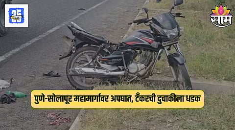 पंढरपूरवरुन घरी परतत असताना पवार दाम्पत्याच्या मोटरसायकलला टँकरने धडक मारली. या धडकीत मल्हारी पवार यांचा मृत्यू झाला, तर त्यांची पत्नी पंखाबाई गंभीररित्या जखमी झाल्या. सोलापूर-पुणे राष्ट्रीय महामार्गावर झालेल्या या दुर्घटनेमुळे परिसरात हळहळ व्यक्त केली जात आहे. या प्रकरणातील टँकरचालकाचा शोध सुरु असल्याची माहिती समोर आली आहे.