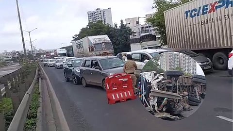 Pune Navle Bridge Accident: पुणे शहरात अपघातांची मालिका सुरूच आहे. पुणे-बंगळुरु महामार्गावरील नवले पुलाजवळ (Pune News) सोमवारी सकाळच्या सुमारास कोळशाने भरलेला कंटेनर भीषण अपघात (Accident) झाला आहे. तीव्र उतारावर असताना चालकाचे कंटेनरवरील नियंत्रण सुटले आणि कंटेनर थेट डिव्हायडरला धडकून रस्त्यावर उलटला. सुदैवाने या घटनेत कोणतीही जीवितहानी झाली नाही.