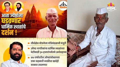 नुकत्याच झालेल्या अर्थसंकल्पामध्ये शिंदे सरकारकडून 'मुख्यमंत्री तीर्थक्षेत्र योजने'ची घोषणा करण्यात आली. या योजनेच्या माध्यमातून राज्यातील ज्येष्ठ नागरिकांसाठी राज्य सरकार देवदर्शन घडवणार आहे. मुख्यमंत्र्यांच्या या खास योजनेची चर्चा सुरू असतानाच आता वेगळच प्रकरण समोर आले आहे. तीन वर्षांपासून घरातून बेपत्ता असलेली व्यक्ती या योजनेच्या जाहिरातीवर आढळून आल्याने खळबळ उडाली आहे.