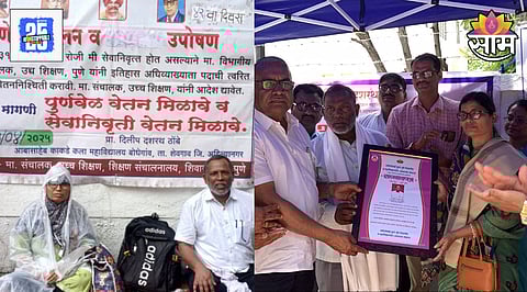 पुणे : पुण्यात महाराष्ट्र राज्याच्या उच्च शिक्षण संचालक कार्यालयासमोर प्राध्यापक दिलीप ठोंबे त्यांच्या कुटुंबासह धरणे आंदोलन आणि उपोषण करत आहेत. पूर्णवेळ वेतननिश्चिती केली जावी, पूर्णवेळ वेतन मिळावे, सेवानिवृत्ती वेतन मिळावे अशी त्यांची मागणी आहे. प्राध्यापक दिलीप ठोंबे आज (३० मे) सेवानिवृत्त होत आहेत. सेवानिवृत्तीच्या दिवशी देखील ठोेंबे यांचे आंदोलन सुरु आहे. त्याचा सेवानिवृत्तीचा कार्यक्रमही संचालक कार्यालयासमोर संपन्न झाला. प्राध्यापक संघटनेद्वारे हा कार्यक्रम आयोजित करण्यात आला होता.
