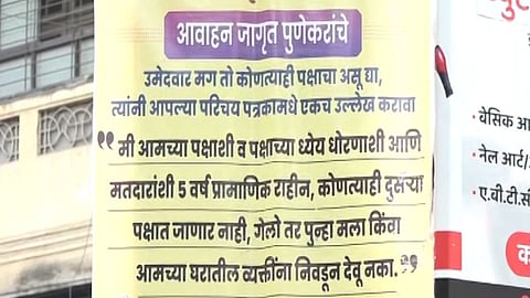 या बॅनरवर लिहिलंय की, जागृत पुणेकरांचं आवाहन. उमेदवार मग तो कोणत्याही पक्षाचा असू द्या, त्यांनी आपल्या परिचय पत्रकामधे एकच उल्लेख करावा. मी आमच्या पक्षाशी व पक्षाच्या ध्येय धोरणाशी आणि मतदारांशी 5 वर्ष प्रामाणिक (Lok Sabha News) राहीन, कोणत्याही दुसऱ्या पक्षात जाणार नाही. गेलो तर पुन्हा मला किंवा आमच्या घरातील व्यक्तींना निवडून देवू नका.