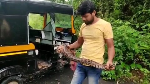 त्यानंतर सर्पमित्र सागर म्हात्रे हे घटनास्थळी पाेहचले. त्यावेळी अजगर रिक्षात मागच्या बाजूस हाेता. म्हात्रे यांनी त्यास काैशल्याने पकडलं. रिक्षातून बाहेर काढलं. या अजगरास एका ड्रममध्ये ठेवण्यात आले. या अजगराला सुखरूप वनविभागाच्या ताब्यात दिले. त्यानंतर वनपरिक्षेत्र अधिकारी आर. एन. चन्ने व वनपाल रामदास घोरले यांच्या मार्गदर्शनाखाली अजगरास नैसर्गिक अधिवासात साेडण्यात आलं. यावेळी वाॅर फाऊंडेशनचे अध्यक्ष योगेश कांबळे , प्राणीमित्र प्रेम आहेर, रेहान मोतीवाला , रोमा त्रिपाठी, वनविभागाचे कर्मचारी जयेश घुगे व वनरक्षक दळवी उपस्थित होते.