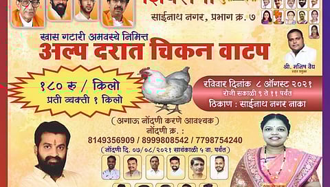 वसई विरार - महापालिका निवडणुकांच्या Election पार्श्वभूमीवर विविध राजकीय पक्षांनी विविध प्रकारच्या उपक्रम राबविण्यावर भर दिला आहे. कारण वसई विरारमध्ये Vasai Virar असे चित्र दिसून येऊ लागले आहे. विरार येथील साईनाथनगरमध्ये गटारीनिमित्ताने शिवसेनेतर्फे Shivsena सवलतीच्या दरात चिकन Chiken उपलब्ध करून देणार असल्याचे फलक लावण्यात आला आहे. या जाहिरात फलकामुळे सर्वत्र या उपक्रमाची चांगलीच चर्चा आता रंगू लागली आहे.