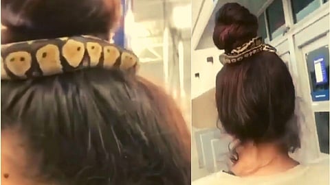 केसांसाठी बऱ्याच एक्ससेरीज असतात. रबर, हेअरबँड, रिबन, क्लिप याशिवाय बरेच काही असत. पण या महिलेने आपल्या केसांकरिता अशी कोणतीच हेअर एक्सेसरीज वापरली नाही तर तिने चक्क एका जिवंत सापाचा वापर केला आहे. केसांना रबर लावण्याऐवजी तिने जिवंत साप (Snake) गुंडाळला आहे.