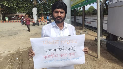 साताऱ्याच्या या शिवसैनिकाचं नाव अद्याप कळू शकलेलं नाही. मात्र या शिवसैनिकानं आपल्या गळ्यात एक पाटी लावली आहे. यावर त्यानं एकनाथ शिंदेंना भावनिक आवाहन केलं आहे. यावर लिहीलंयं की, "शिवनसेना जिंदाबाद! एकनाथ शिंदे (भाई) मातोश्रीवर परत चला, उद्धवजी आणि आदित्यजींना साथ द्या" असा मजकूर यावर लिहीलेला आहे. यात त्याने उद्धव ठाकरे आणि आदित्य ठाकरे यांना साथ देण्याचं भावनिक आवाहन एकनाथ शिंदेंना केलं आहे. दरम्यान हॉटेलबाहेर उभा असलेल्या या शिवसैनिकाला स्थानिक पोलिसांनी ताब्यात घेतलं आहे.