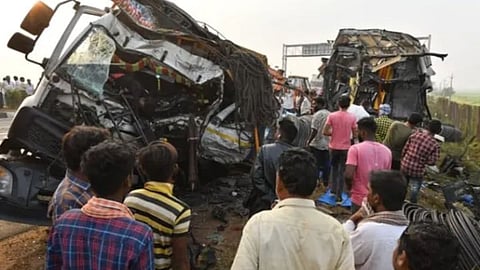 याबाबत सविस्तर माहिती अशी की, आंध्र प्रदेशातील (Andhra Pradesh) नेल्लोर जिल्ह्यात एक भीषण अपघाताची घटना घडली. जिल्ह्यातील मुसुनुरु टोल प्लाझा येथे ट्रक आणि बसची धडक झाली. या अपघातात 6 जणांचा मृत्यू झाला असून 20 जण जखमी झाले आहेत. मिळालेल्या माहितीनुसार, हा अपघात रात्री 2 वाजता श्रीकालहस्तीकडे जाणाऱ्या दोन बैलांना घेऊन जाणाऱ्या ट्रकला लोखंडी वाहतूक करणाऱ्या दुसऱ्या ट्रकने मागून धडक दिल्याने हा अपघात झाला.