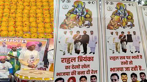 काँग्रेस कार्यकर्त्यांनी लावलेल्या पोस्टर्सवर श्रीरामाचे फोटो आहेत. याशिवाय पोस्टरवर राहुल गांधी आणि प्रियंका गांधी यांच्या फोटोसह अनेक घोषणा लिहिल्या आहेत. राहुल सब पर भारी है, तभी तो भाजप जा रही है.., अशा घोषणा पोस्टर्सवर लिहिण्यात आल्या आहेत.