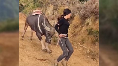 माणसांसोबत राहणारे प्राणी माणसांचे अनुकरण करतात, असं नेहमी म्हणतात. याचाच प्रत्यय या व्हिडीओतून आलाय. व्हायरल झालेल्या व्हिडीओत एक तरुणी म्हशीला (Buffalo) घेऊन जाताना दिसत आहे. या तरुणीने (Woman) म्हशीला बांधलेला दोर आपल्या हातात घट्ट पकडला आहे.
