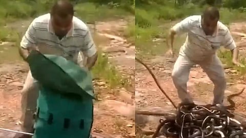 या व्हिडिओमध्ये एक व्यक्ती हिरव्या रंगाचे पोते घेवून जाताना दिसत आहे. तो व्यक्ती जंगलात जातो आणि पोते खाली ठेवतो. आणि एकापाठोपाठ एक असे असंख्य साप बाहेर पडताना दिसतात. ही व्यक्ती न घाबरता या सापांना हातात घेवून अगदी आरामात बाहेर काढताना दिसत आहे.