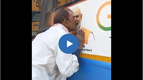 मिळालेल्या माहितीनुसार, व्हायरल होत असलेला व्हिडीओ कर्नाटकातील आहे. व्हिडीओत दिसणारी व्यक्ती शेतकरी आहे. एका बसवर पंतप्रधान नरेंद्र मोदींचा फोटा पाहून शेतकरी काहीसा भावूक झालेला दिसला. शेतकरी मोदींच्या फोटोशी बोलतानाही दिसत आहे. मोदींशी बोलताना या शेतकऱ्याला रडू देखील आलेलं पाहायया मिळतंय. शेतकरी मोदींच्या फोटोला किस करतानाही दिसतोय.