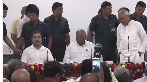 Patna Opposition Meeting News Today: ''आमच्यात थोडे मतभेद आहेत, पण आम्ही एकत्र लढणार'', असं काँग्रेस नेते राहुल गांधी (Rahul Gnadhi) म्हणाले आहेत. आज देशातील 17 विरोधी पक्षातील नेत्यांची बैठक पाटण्यात पार पडली. यामध्ये यामध्ये राष्ट्रवादी पक्षाचे सर्वेसर्वा शरद पवार (Sharad Pawar), उद्धव ठाकरे (Uddhav Thackeray), ममता बॅनर्जी (Mamata Banerjee), अरविंद केजरीवाल (Arvind Kejriwal), भगवंत मान, एमके स्टॅलिन यांच्यासह सहा राज्यांचे मुख्यमंत्री आणि अखिलेश यादव, मेहबुबा मुफ्ती यांच्यासह पाच राज्यांचे माजी मुख्यमंत्री सहभागी झाले होते.