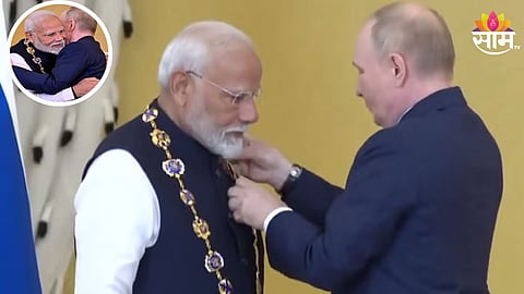 पंतप्रधान नरेंद्र मोदी यांना रशियाचा सर्वोच्च नागरी सन्मान 'ऑर्डर ऑफ सेंट अँड्र्यू द अपॉस्टल'ने सन्मानित करण्यात आलं आहे. मंगळवारी रशियाचे राष्ट्राध्यक्ष व्लादिमीर पुतिन यांनी एका कार्यक्रमात पंतप्रधान मोदींना या सन्मानाने सन्मानित केले. पंतप्रधान मोदी सध्या रशियाच्या दौऱ्यावर आहेत.
