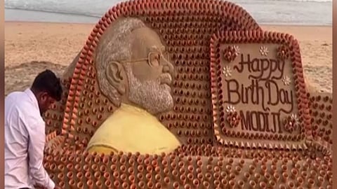 नवी दिल्ली: पंतप्रधान नरेंद्र मोदी (Pm Narendra Modi) यांच्या ७२ व्या वाढदिवसानिमित्त (Happy Birth PM Narendra Modi) प्रसिद्ध शिल्पकार सुदर्शन पटनायक यांनी मोदींना विशेष शुभेच्छा दिल्या आहेत. त्यांनी ओडिशाच्या पुरी समुद्रकिनाऱ्यावर १,२१३ मातीच्या चहाच्या कपांमधून पंतप्रधान मोदींचे शिल्प बनवले आहे.